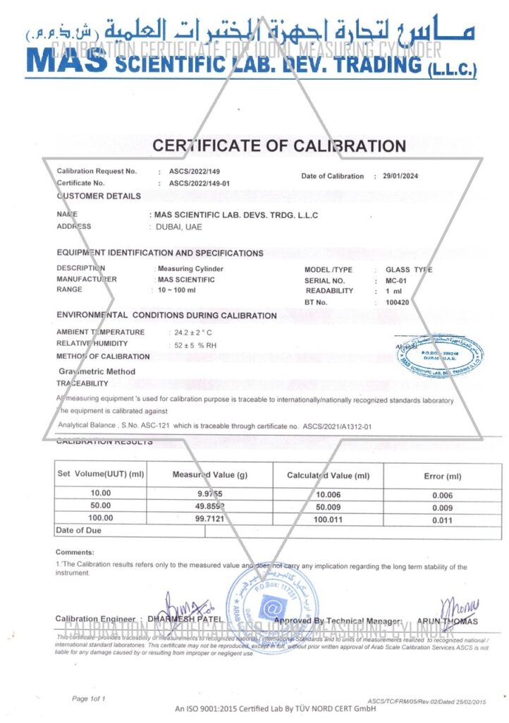 Calibration Certificate for 100ml Measuring Cylinder Batch No100420 – MAS 1252-100