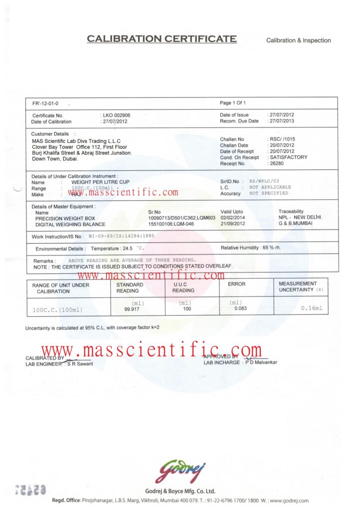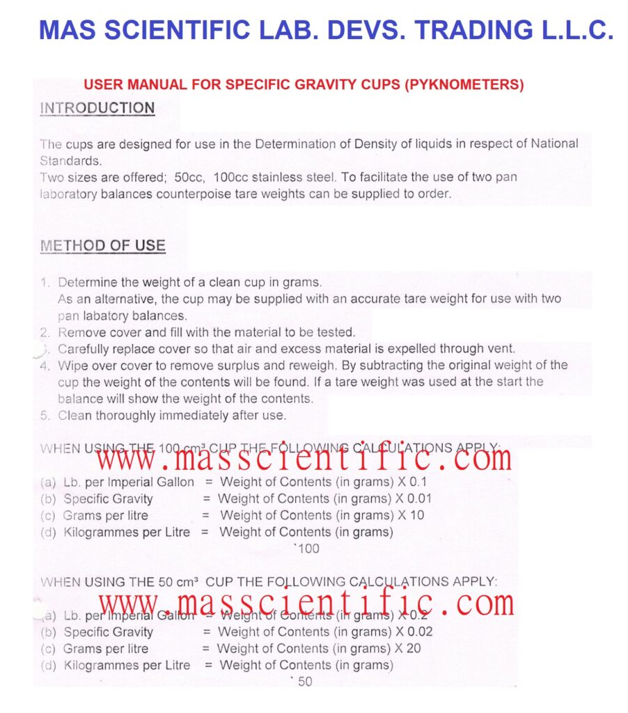 If you weigh the pycnometer empty, full of water, and then full of a liquid whose specific gravity is recorded, then the accurate calculation of the specific gravity can be read. In addition to measuring liquids, it is possible to measure the particle density of powders using the pycnometer which usually would not be possible using the usual method.
