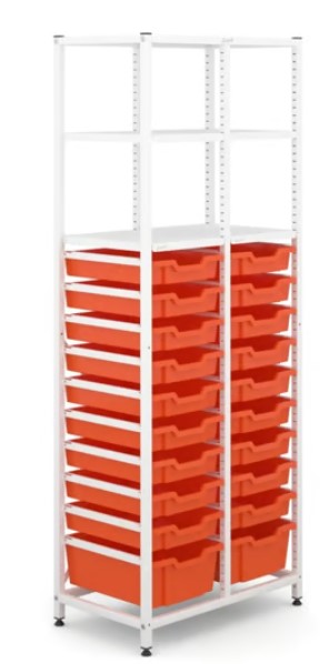 Our Tall Double Frame is an ideal solution for storing and easily accessing a wide range of items in any lab or prep room. Available in a variety of styles to accommodate different combinations of tray storage, you have the flexibility to choose the storage which best suits your needs. Storing up to a total of 34 trays or available with a mix of trays & shelves, which are available in four different heights and a range of colours, this frame will allow any teacher or technician to organise to their heart’s content. You can also be safe in the knowledge that every Gratnells piece is designed with safety as the top priority. With tops, adjustable feet and back diagonal bars for additional rigidity, this frame can also be attached to the wall for full stability and peace of mind. Made from sturdy, powder coated steel, our frame is available in a range of three colours – Gratnells Grey, Silver and White – to mirror your curriculum subject or school palette.