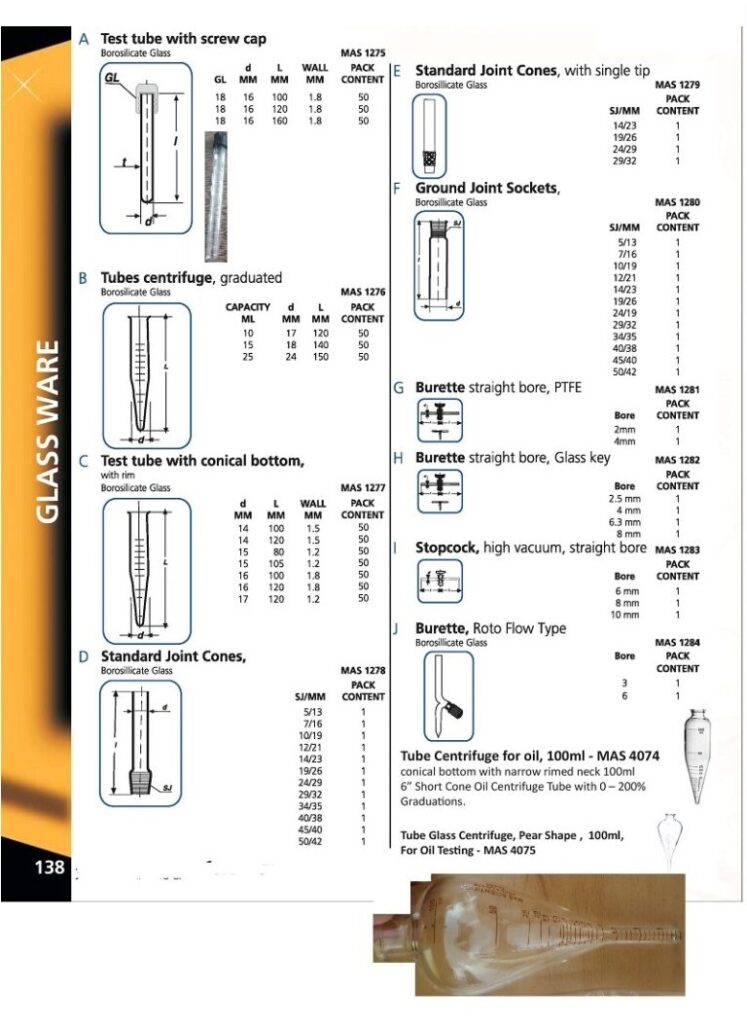 Test Tube Screw Cap, Centrifuge Tubes, Burettes, Joint Cones & Socket MAS 1275-1276-1277-1278-1279-1280-1281-1282-1283-1284-4074-4075